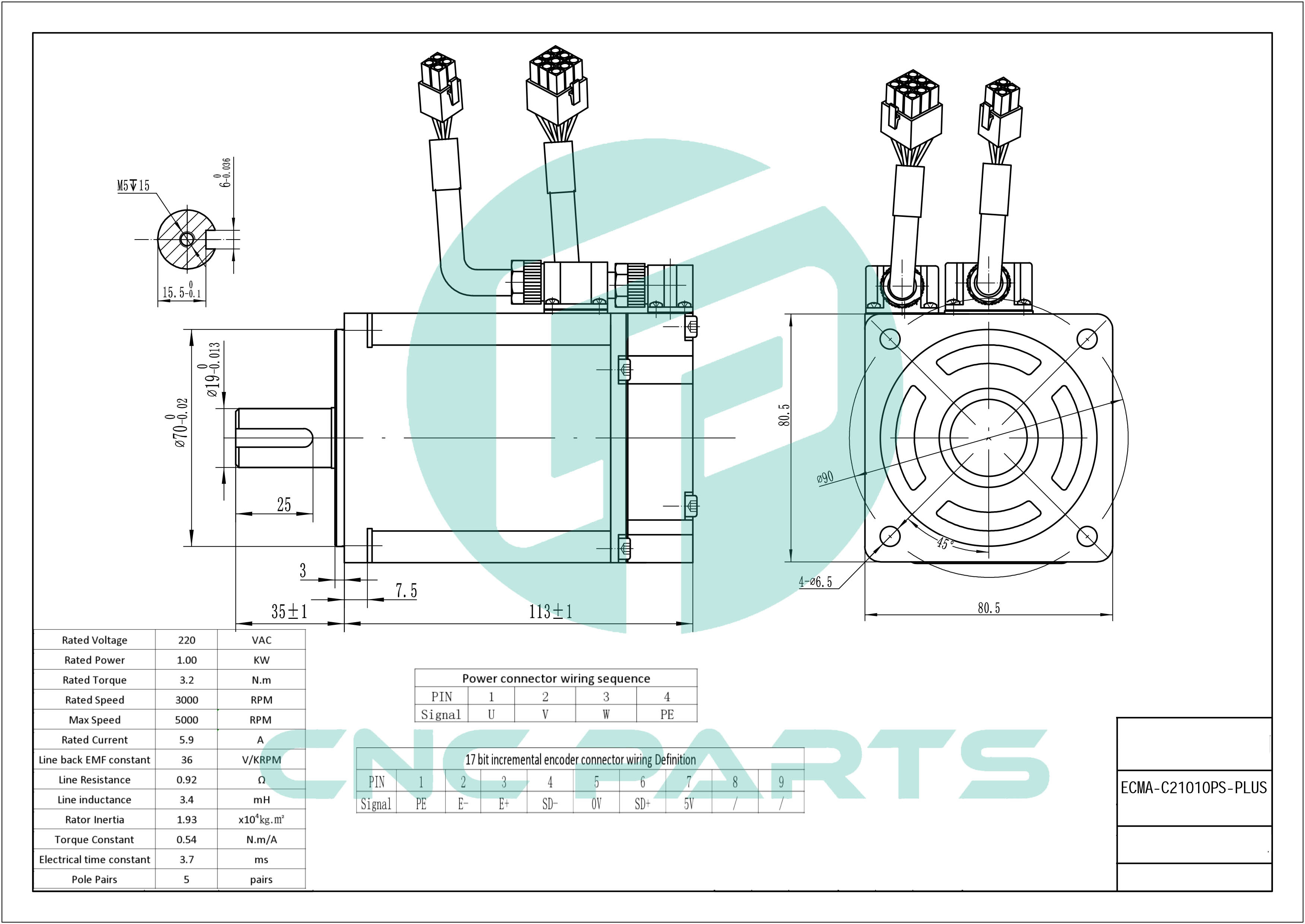 دیتاشیت سروو موتور 1kw کیلووات پلاس hqm اچ کیو ام 3000 دور rpm مدل ECMA-C21010PS-PLUS کد درایو ASD-F-1021 به همراه کانکتور