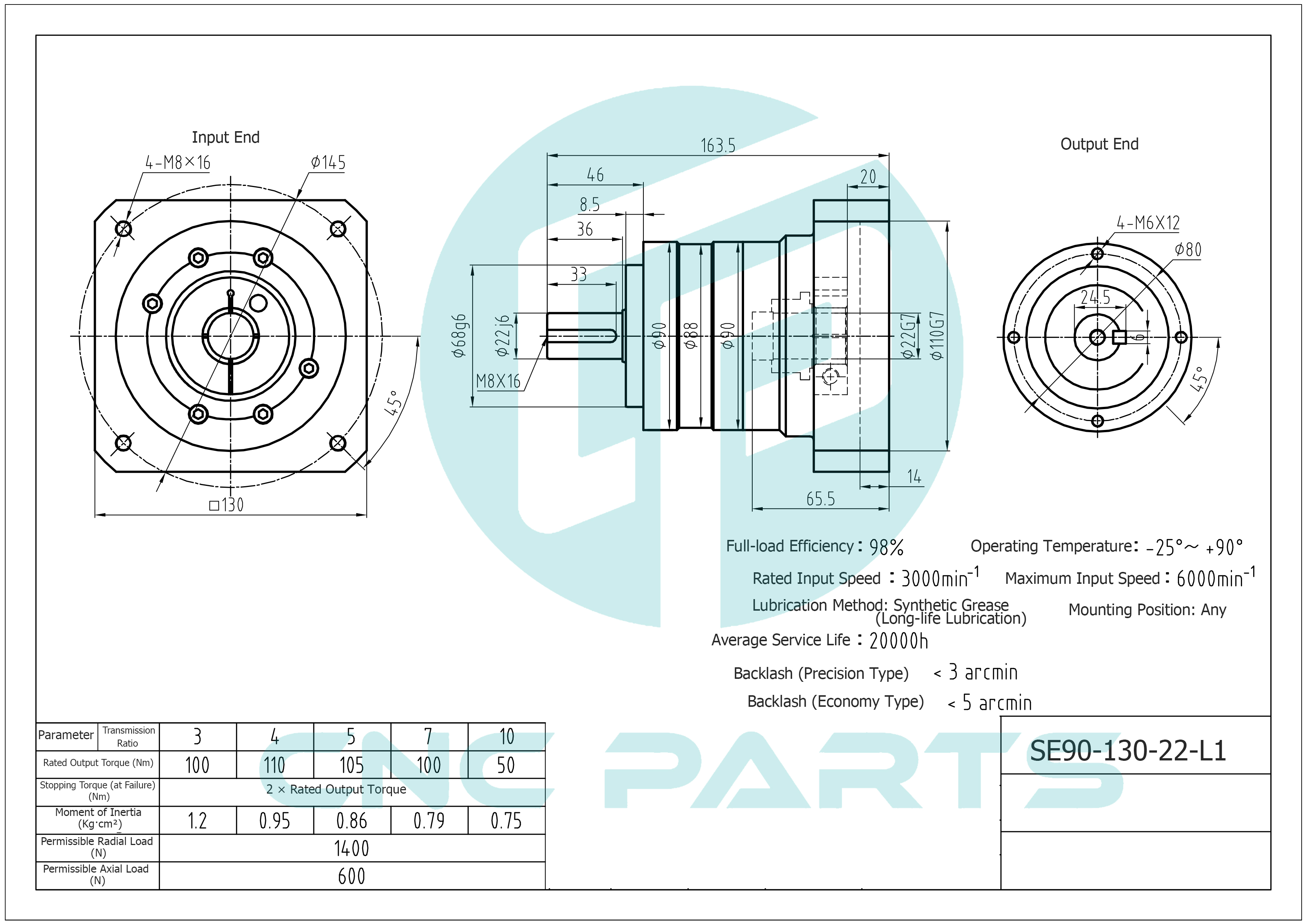 گیربکس 90 خورشیدی سرووموتور HQM اچ کیو ام مدل SE90-005-130-22 سایز 90 نسبت 1 به 5 شفت ورودی 22 شفت خروجی 22 فلنج گرد مناسب یک کیلووات 2000 دور دلتا (گیربکس سیاره ای) (اورجینال وارداتی)