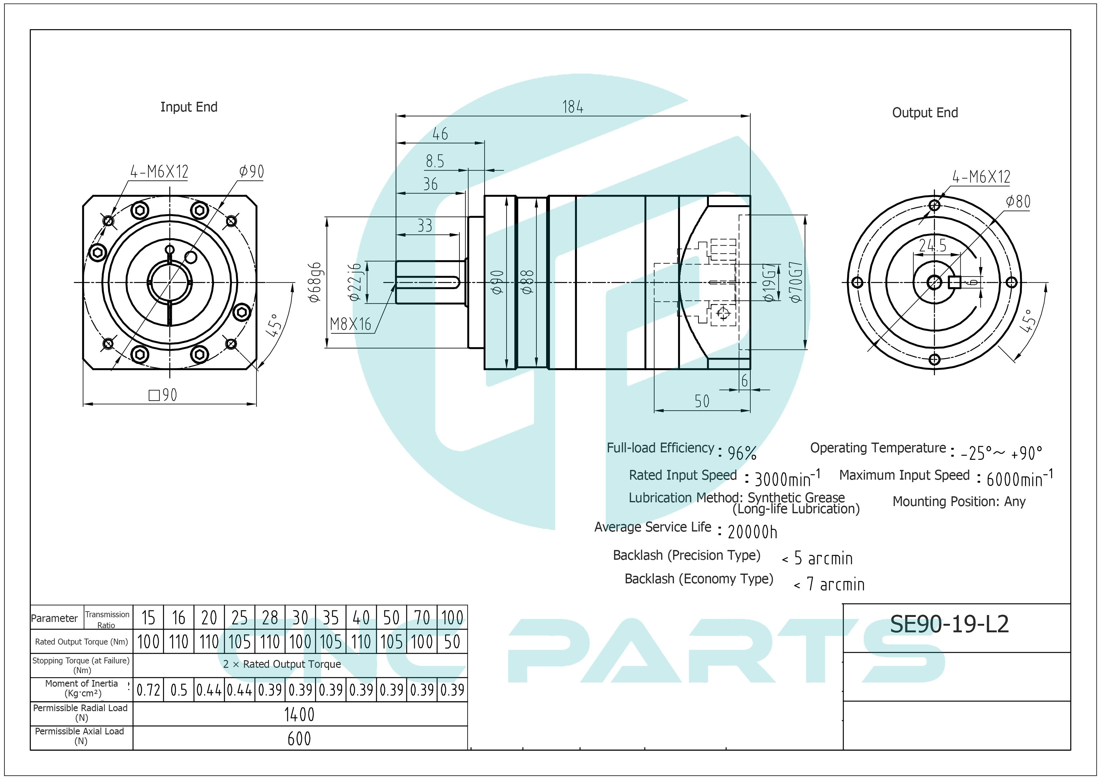 گیربکس 90 خورشیدی سرووموتور HQM اچ کیو ام مدل SE90-020-19 سایز 90 نسبت 1 به 20 شفت ورودی 19 شفت خروجی 22 فلنج گرد مناسب 750 وات 3000 دور (گیربکس سیاره ای) (اورجینال وارداتی)